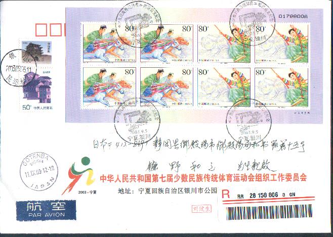 03-全国第七届少数民族运动会小版张原地首日实寄日本封(符资) Post By:2003/11/10 23:01:29 [只看该作者]