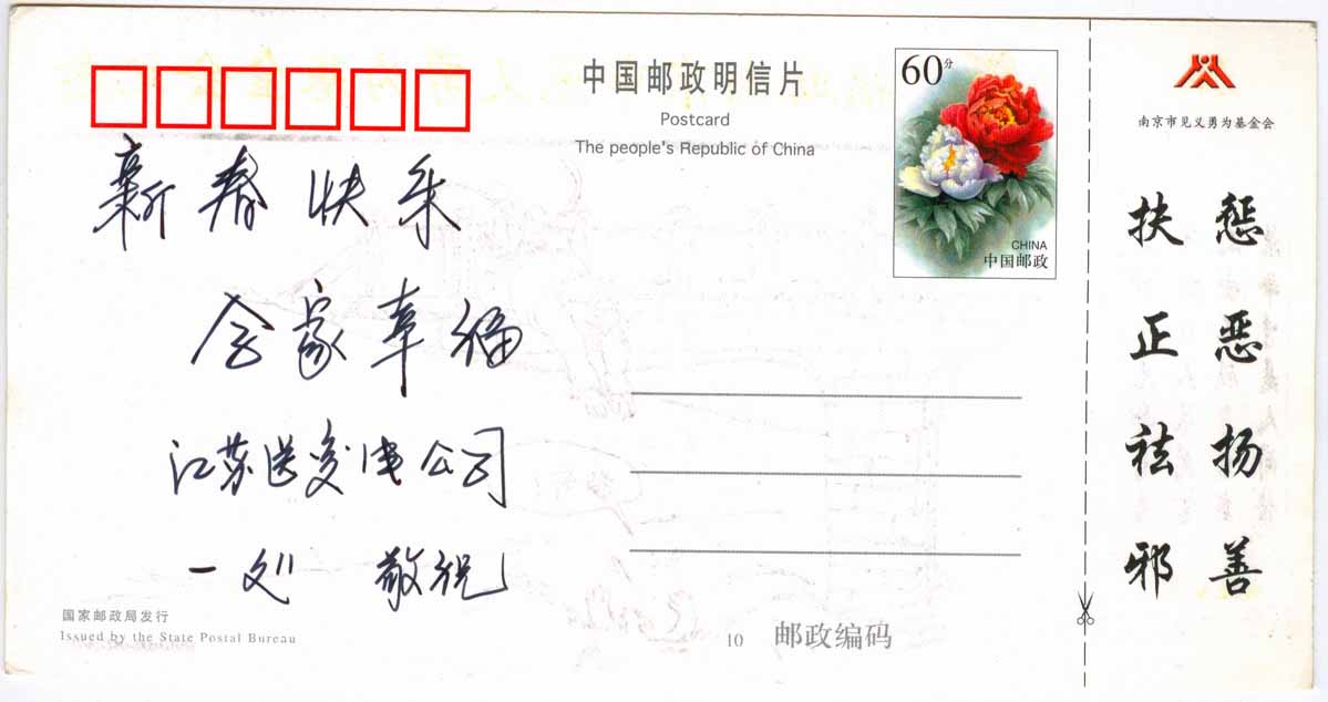 ![]() 江苏省泰州市景光小区17#楼105室 张金明 邮编:225300 电话:13033588979 |